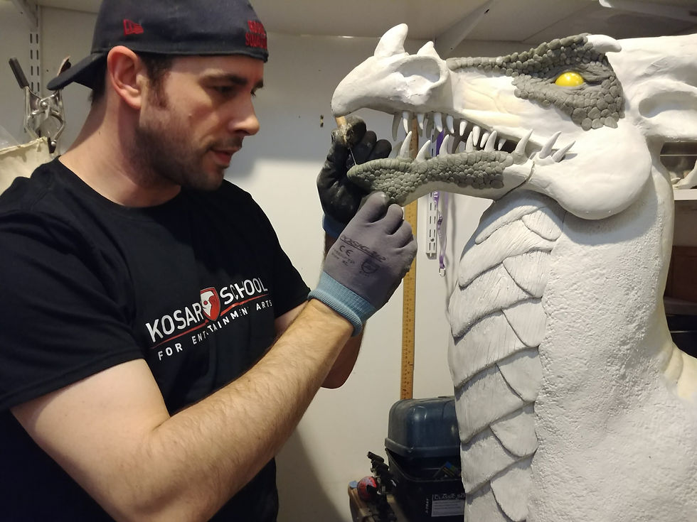 It was about that time I needed to finish the mouth. I added the tongue, but I knew once the lower jaw was permanently attached, there was no way I would be able to paint inside the mouth. So, it was painted first, then glued on with epoxy and detailed sculpting was completed to cover the seam. I started my base coat of black paint on the head with a brush. I would be able to spray paint the body, but I didn't want to risk spraying over any part of the mouth.